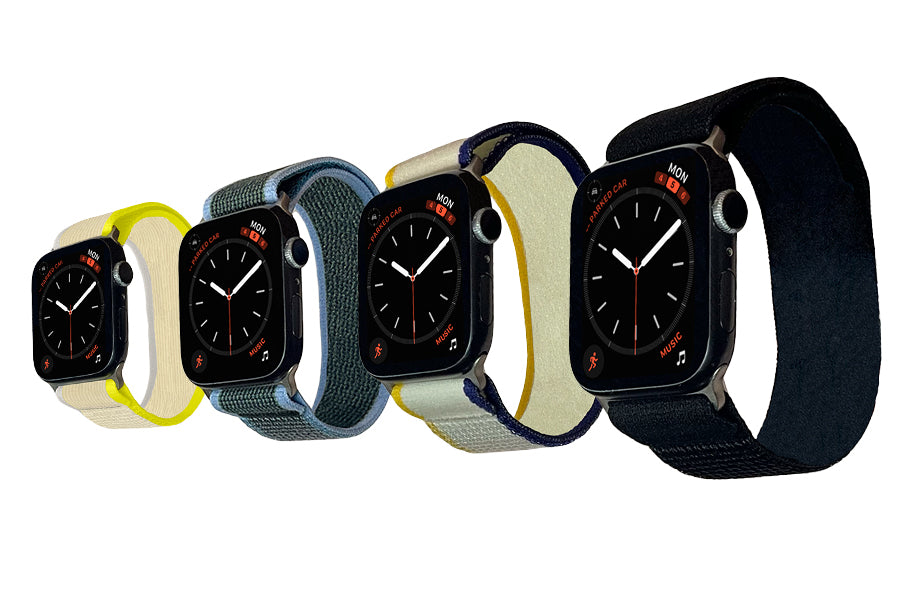 The Infinity Loop and Sport Loop are made of ultra-soft silicone and the Woven Loop and Velcro Loop are made of soft elastic nylon. The Bella Band is made of natural resin extracted from plants and is BPA free. The Titanium Band is made from titanium.